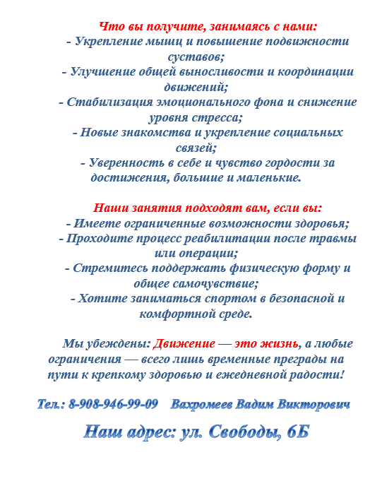 Занятия адаптивной физической культурой (АФК) и спортом доступны людям с инвалидностью, в том числе имеющих поражение опорно-двигательного аппарата. Доступность обеспечивается через специализированные программы, которые учитывают индивидуальные физические и медицинские особенности каждого человека. Основная цель таких занятий — коррекция недостатков, компенсация нарушений здоровья, повышение уверенности в себе и формирование потребности в систематических занятиях.